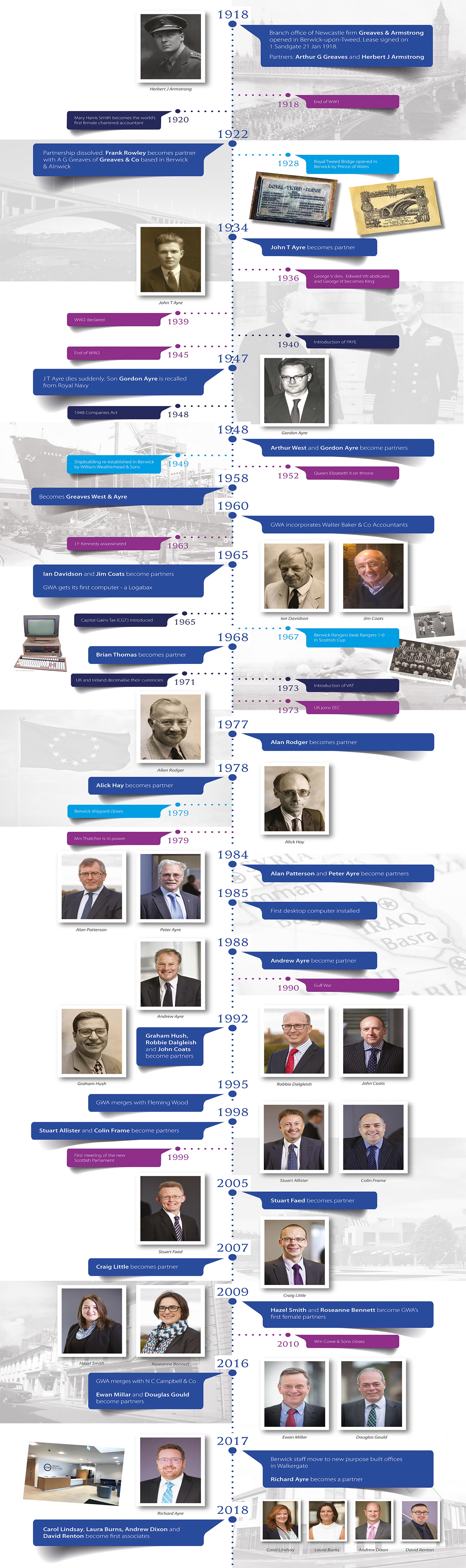 Over the past 100 years the world has changed beyond recognition.  The accountancy profession is also very different to what it was in 1918. GWA has continued to adapt to new ways of working, while maintaining the traditional values on which it was founded. Our philosophy of providing Quality Advice and Quality Service has been the building block for our continued growth and success.